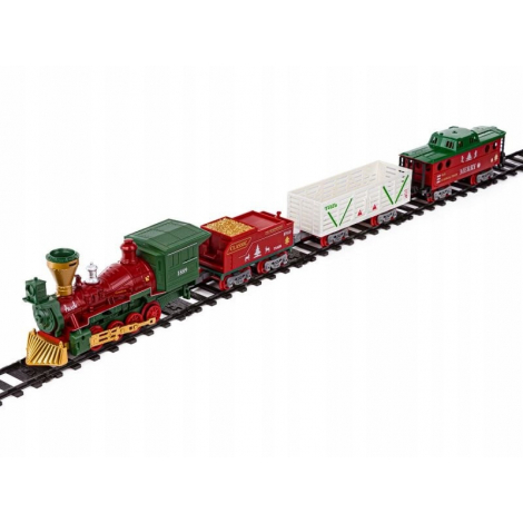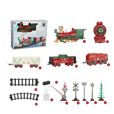 Комплект поставки: локомотив, вагонетка с углем, вагон-рефрижератор, вагон-хоппер, железнодорожное полотно (18 сегментов), железнодорожные знаки, деревья, емкость для воды