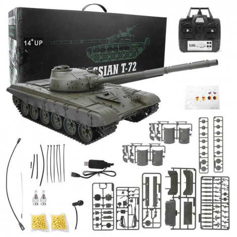 Радиоуправляемый танк Heng Long T-72 - копия послевоенного советского основного боевого танка. Модель танка максимально приближен к оригиналу. Все движения танка как у настоящего — гусеницы управляются независимо. Он оснащен пневматической и ик-пушками. Танк Heng Long совершает движения вперед и назад на 2-х скоростях, разворот на 360, вращающаяся башня с поднимающимся-опускающимся дулом. Танк способен издавать реалистичные звуки. Это и звук мощного танкового мотора, звуки при различных движениях, выстрелы из орудий. Танк выпускает дым из выхлопных труб, для этого на танке установлен дымогенератор, работающий на масле.