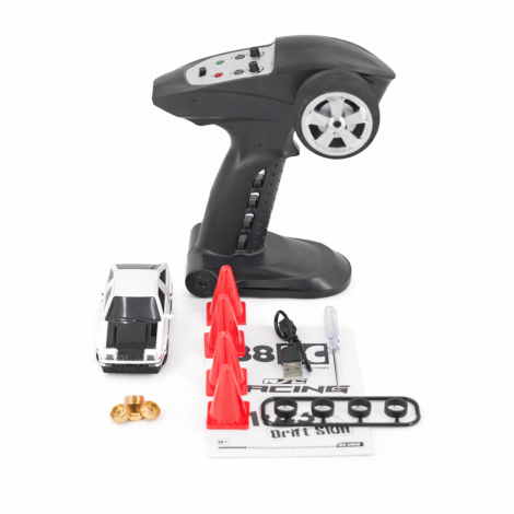 Радиоуправляемая дрифт машина Toyota AE86 1:43 - RC43-A1 - это машина, которая предназначена для дрифта. Она имеет полный привод и выполненная в масштабе 1:43. Машинка управляется при помощи пульта ДУ, работающего на частоте 2,4 ГГц. В наборе также поставляются комплект запасных колес, дорожные конусы, зарядное устройство и аккумулятор. Во время движения у машинки светятся фары.